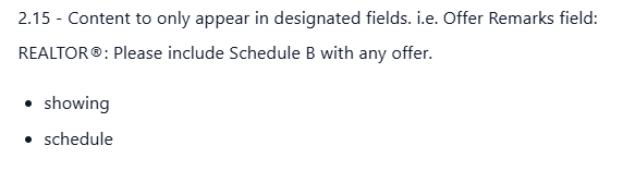- Contact information, virtual tour information, multi-media URLs (if any), and remarks must be located in the designated area of the listing and not reproduced in any other field, subject to any exceptions set out in these rules.