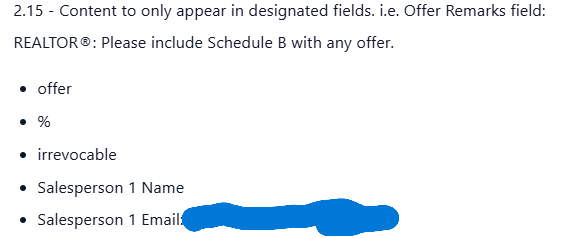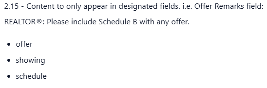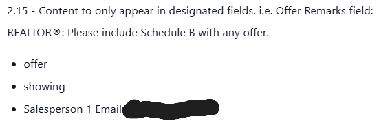 Any and all wording regarding showings, offers, salesperson, or commission must go in the applicable fields - not in realtor remarks (as per ITSO Rules).