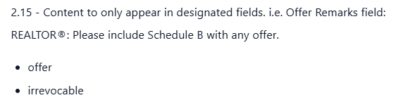 - Any conditions that belong in dedicated fields (offer instructions, commission, showing notes).